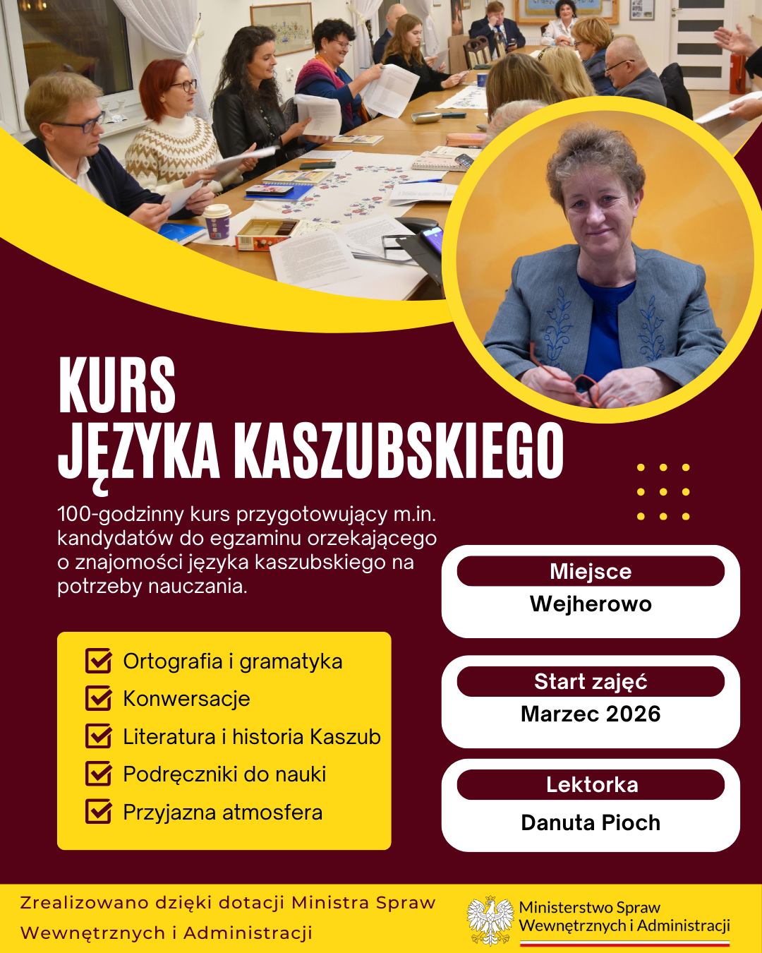DANUTA PIOCH – przewodnicząca Rady Języka Kaszubskiego, autorka programów nauczania i podręczników do nauki języka kaszubskiego, wykładowczyni na studiach podyplomowych Nauczanie języka kaszubskiego UG (lektorat, metodyka nauczania j. kaszubskiego), lektorka wielu kursów dla dorosłych.