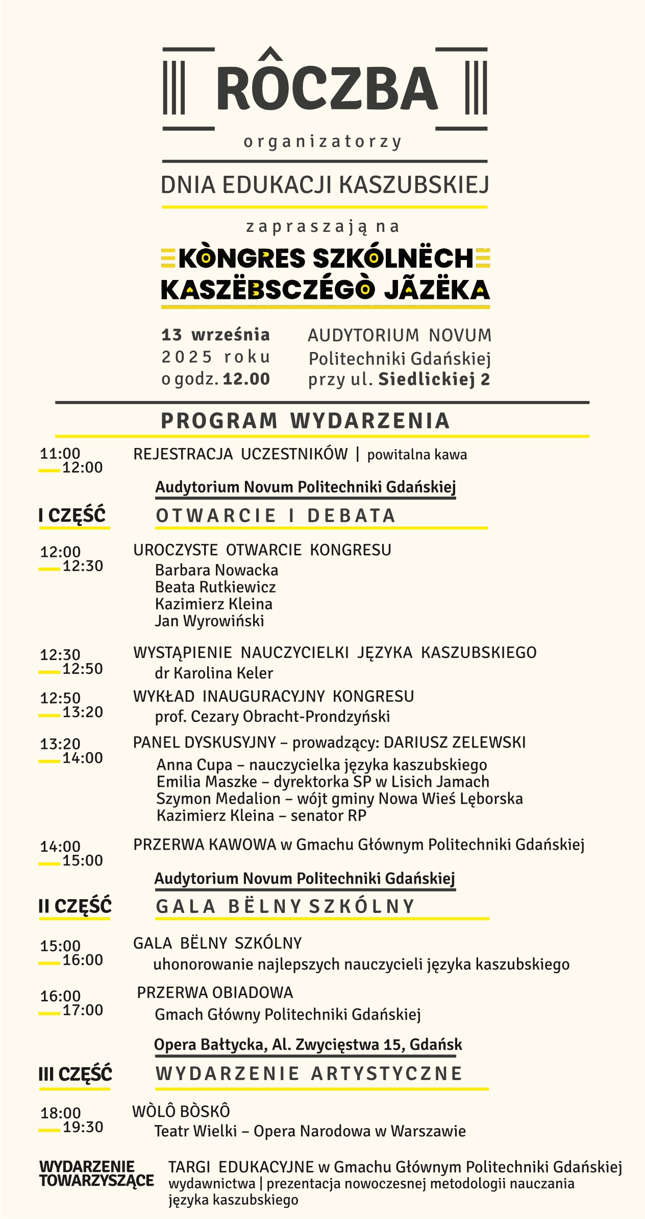Dzięki codziennej pracy Szkólnych, czyli Nauczycieli języka kaszubskiego, kaszubszczyzna wciąż trwa, rozwija się i ma szansę przetrwać wśród kolejnych pokoleń. By uhonorować Nauczycieli oraz pokazać ich siłę, z okazji Dnia Edukacji Kaszubskiej 13 września 2025 r. na Politechnice Gdańskiej odbędzie się Kongres Nauczycieli Języka Kaszubskiego pod hasłem: Siła w Nauczycielach Kaszubskiego!